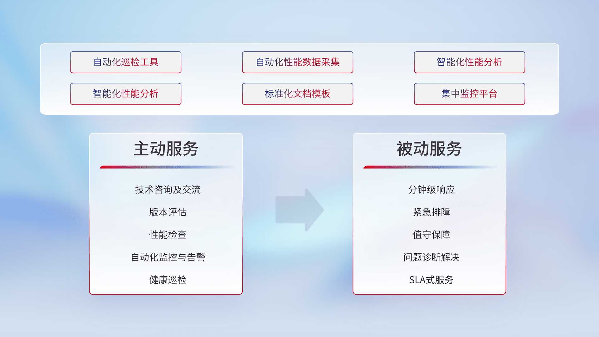 智能化工具和标准化文档,,,保障服务质量,,提供主动服务(包含技术咨询、、、、版本评估、、、、性能检查、、、自动化监控与告警、、、、健康巡检)和被动服务包含(分钟级响应、、、、紧急排障、、值守保障、、、、问题诊断解决、、、、SLA服务)。。。。
